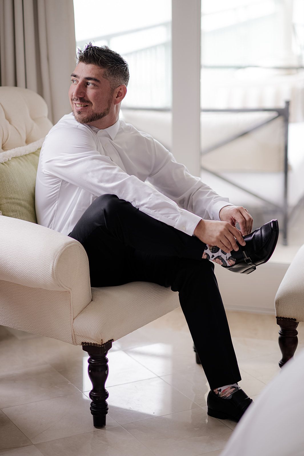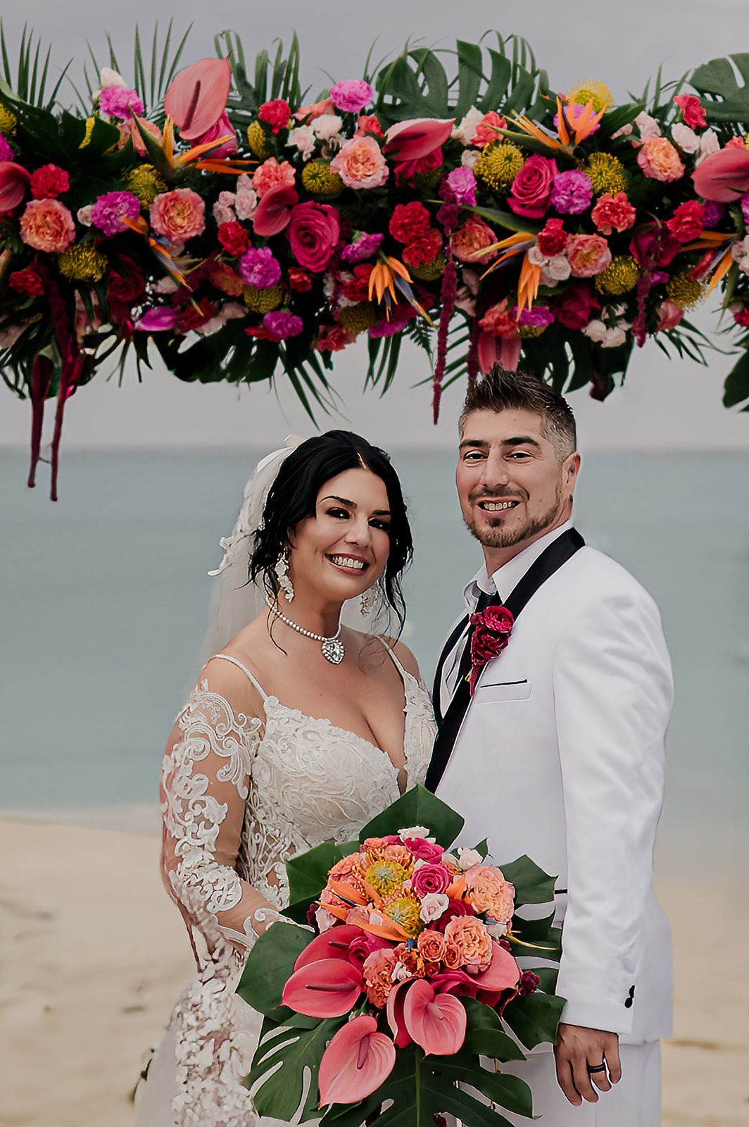 The morning of the wedding, our suite buzzed with joy as the girls got ready and the guys shared stories. After a teary first look with my dad, I met George on a private terrace overlooking the lush, flower-filled resort where we exchanged vows. He surprised me with the Titanic necklace and we captured stunning content across every inch of the resort, from the vibrant tropical blooms to the turquoise waters of Grace Bay. Just as our ceremony was about to begin, the skies opened with an unexpected hour-long downpour. Still, I told everyone, “We’re doing this.” As soon as I stepped onto the beach aisle with both of my parents by my side, the rain stopped. A saxophonist played as I walked beneath our tropical floral arch, locking eyes with George, both of us grinning from ear to ear.