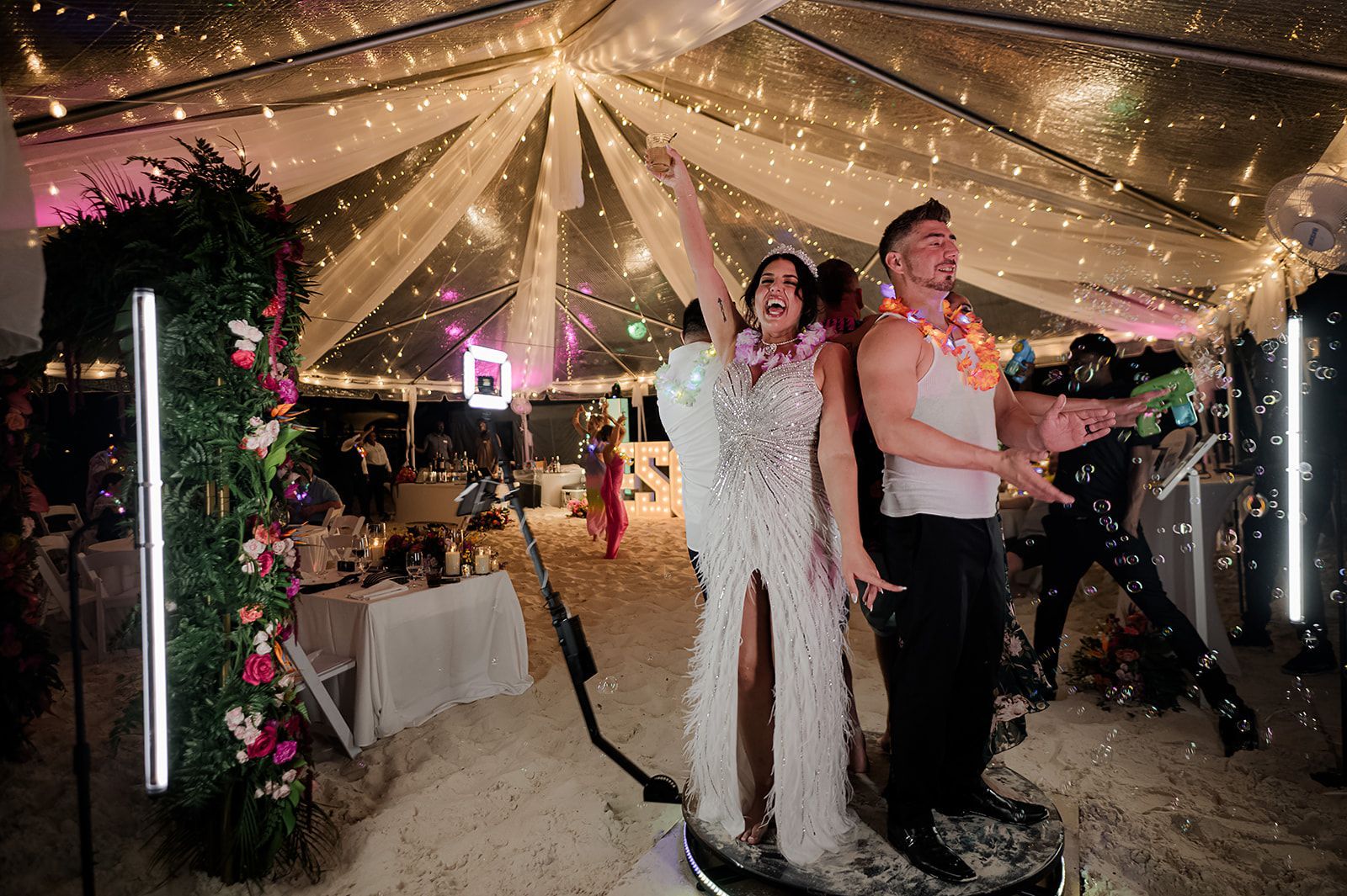 Our reception was held beneath a clear tent, draped in romantic fabric and glowing string lights with the stars shining above. Guests dined, danced, and celebrated under our marquee-lit last name — Eschker — with DJ Dayoh keeping the energy alive all night. From fire dancers and our 360 photo booth to jumping into the ocean fully clothed, the night was filled with magic. The next day, we took a private boat through the world’s third-largest barrier reef, visited a shipwreck, Iguana Island, and Noah’s Ark, a floating ocean bar. After family departed, George and I stayed behind to soak in our first days as newlyweds with in-room fine dining, spa massages, and sunset walks. Our wedding wasn’t just a day — it was an unforgettable experience that exceeded every dream I ever had.
